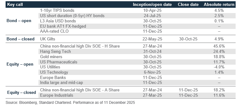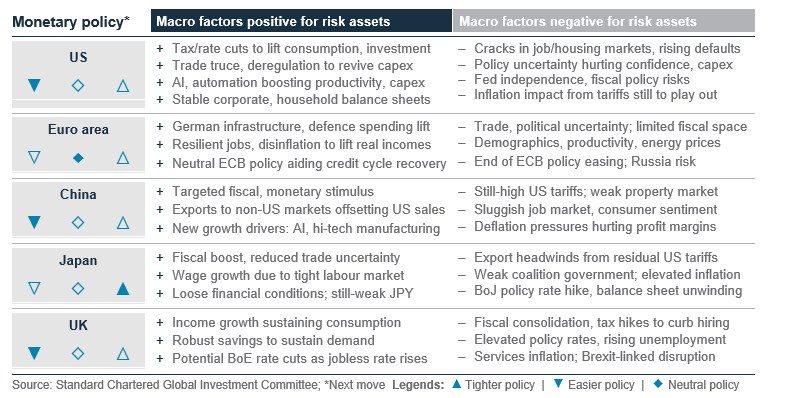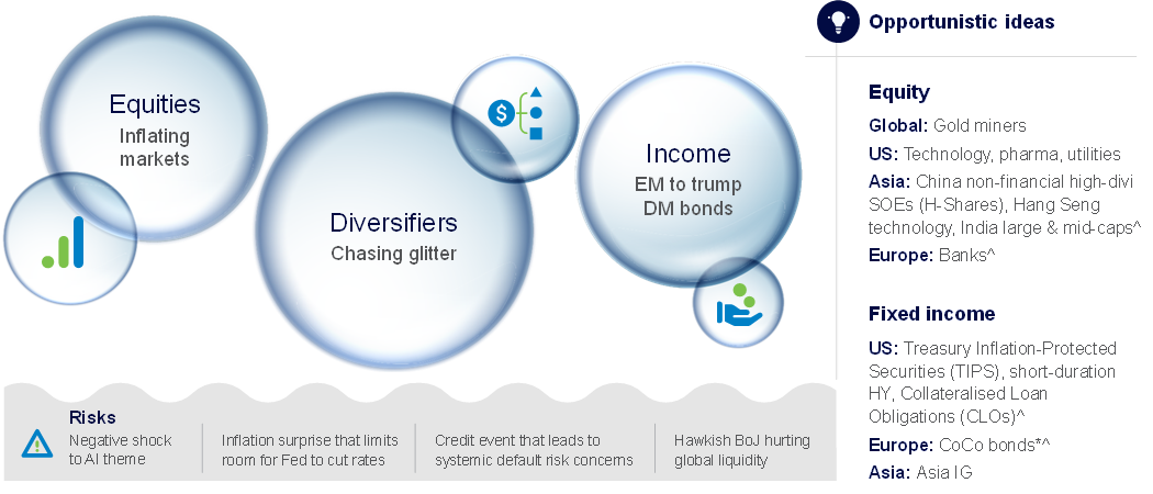 - Theme #1 – Equities: Inflating markets, inflating AI debate. We expect AI-driven earnings growth to overcome elevated valuations, but it is time to diversify.