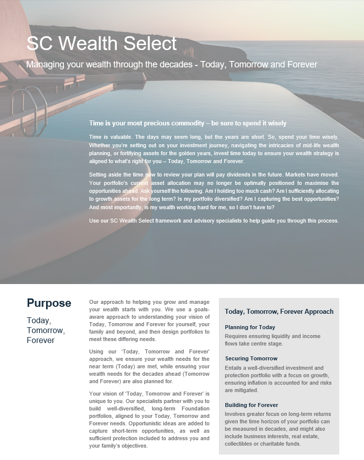 This document is confidential and may also be privileged. If you are not the intended recipient, please destroy all copies and notify the sender immediately. This document is being distributed for general information only and is subject to the relevant disclaimers available at our Standard Chartered website under Regulatory disclosures. It is not and does not constitute research material, independent research, an offer, recommendation or solicitation to enter into any transaction or adopt any hedging, trading or investment strategy, in relation to any securities or other financial instruments. This document is for general evaluation only. It does not take into account the specific investment objectives, financial situation or particular needs of any particular person or class of persons and it has not been prepared for any particular person or class of persons. You should not rely on any contents of this document in making any investment decisions. Before making any investment, you should carefully read the relevant offering documents and seek independent legal, tax and regulatory advice. In particular, we recommend you to seek advice regarding the suitability of the investment product, taking into account your specific investment objectives, financial situation or particular needs, before you make a commitment to purchase the investment product. Opinions, projections and estimates are solely those of SC at the date of this document and subject to change without notice. Past performance is not indicative of future results and no representation or warranty is made regarding future performance. The value of investments, and the income from them, can go down as well as up, and you may not recover the amount of your original investment. You are not certain to make a profit and may lose money. Any forecast contained herein as to likely future movements in rates or prices or likely future events or occurrences constitutes an opinion only and is not indicative of actual future movements in rates or prices or actual future events or occurrences (as the case may be). This document must not be forwarded or otherwise made available to any other person without the express written consent of the Standard Chartered Group (as defined below). Standard Chartered Bank is incorporated in England with limited liability by Royal Charter 1853 Reference Number ZC18. The Principal Office of the Company is situated in England at 1 Basinghall Avenue, London, EC2V 5DD. Standard Chartered Bank is authorised by the Prudential Regulation Authority and regulated by the Financial Conduct Authority and Prudential Regulation Authority. Standard Chartered PLC, the ultimate parent company of Standard Chartered Bank, together with its subsidiaries and affiliates (including each branch or representative office), form the Standard Chartered Group. Standard Chartered Private Bank is the private banking division of Standard Chartered. Private banking activities may be carried out internationally by different legal entities and affiliates within the Standard Chartered Group (each an “SC Group Entity”) according to local regulatory requirements. Not all products and services are provided by all branches, subsidiaries and affiliates within the Standard Chartered Group. Some of the SC Group Entities only act as representatives of Standard Chartered Private Bank and may not be able to offer products and services or offer advice to clients.