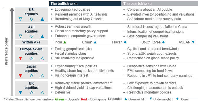 We remain Overweight Chinese equities, with a preference for offshore markets. We expect targeted policy stimulus and strong earnings growth related to the AI theme to provide strong support.