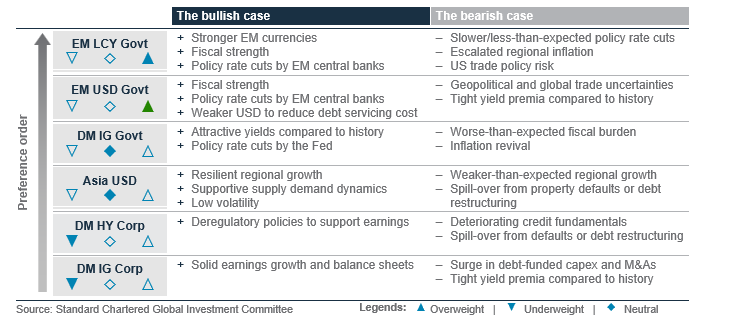 - Theme #2 – Income: EM to trump DM bonds. EM (USD and LCY) bonds offer attractive yields and diversification from a Fed-centric outlook.