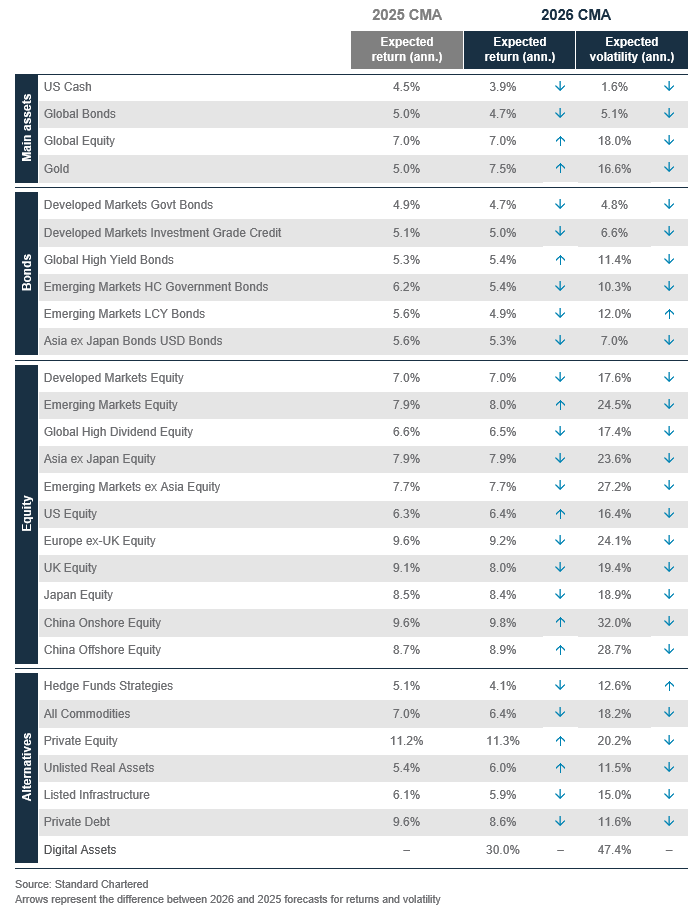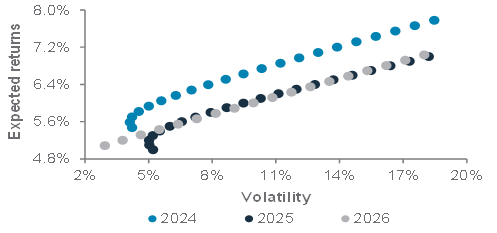 The 2026 CMAs reflect a world of moderate growth, steadier inflation and structurally higher yields. We see the efficient frontier curve flatter than last year, given improved bond yields and broadly stable equity returns.