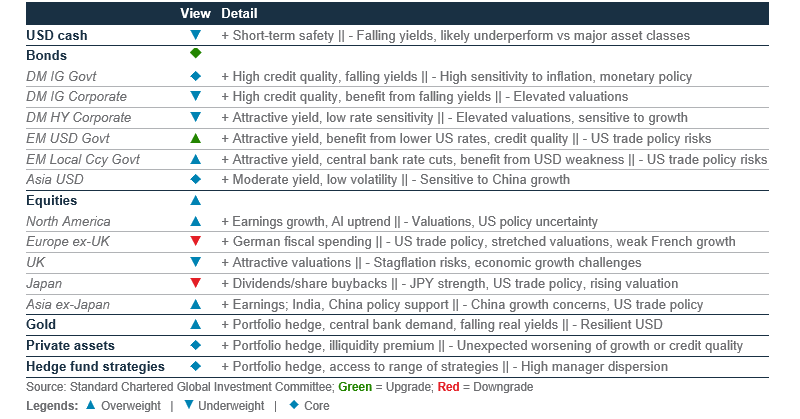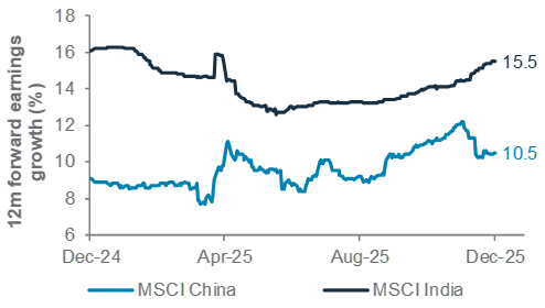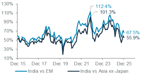 One is through regional diversification. We are Overweight US equities relative to global equities, with returns led mainly by continued earnings growth from the technology sector. We balance this with an Overweight on Asia ex-Japan. While there is some spillover of the AI theme via Asia ex-Japan’s technology sector, the region also provides a route to (i) implement our weak USD view, which historically is consistent with EM outperformance, (ii) domestic policy stimulus, particularly in China and India, and (iii) equities’ exposure at more moderate valuations than US equities.