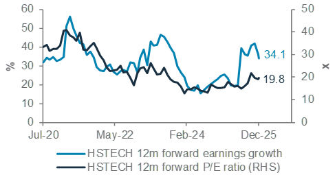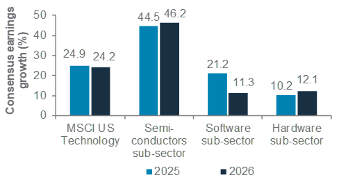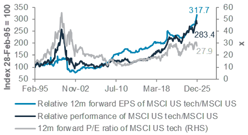 Whether markets are too expensive or whether valuations are justified by earnings growth remains one of the central debates going into 2026. This debate remains disproportionately focused on US equities, and the US technology sector, in particular. We see this debate persisting through 2026, resulting in bouts of volatility when high expectations are not decisively exceeded.
