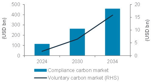 The global compliance market was valued at around USD 113bn in 2024 and is expected to grow by about 15% annually between 2025 and 2034. Beyond corporates purchasing carbon credits, governments are increasingly entering the market as buyers. Singapore announced in September 2025 that it will buy approximately SGD 76.4m worth of carbon credits from international projects. As governments look to meet their national climate targets, we expect carbon markets to feature among their strategies.