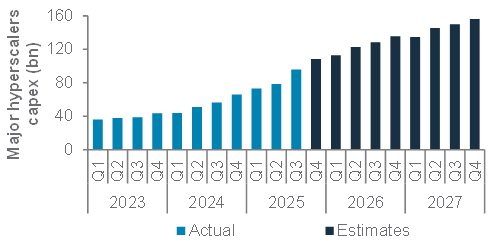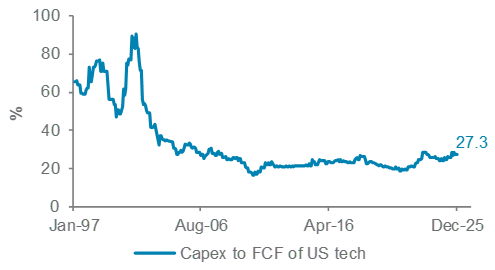 Discussion of an equity market bubble, led by the boom in Artificial Intelligence, is rife. However, we do not see the embedded leverage in the system being similar to the years leading into the 2008 Global Financial Crisis. Perhaps the closer comparison is the dot.com bubble in the late 1990s. However, even here, there are key differences both in terms of the magnitude of investments being made – still much lower relative to the size of the economy – and the profitability of those making the investments. Therefore, we believe there is still some way to go before we get to bubble-like proportions.