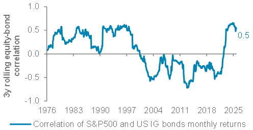 Although equity-bond correlations are elevated, bonds are gradually regaining their traditional diversification benefits, with the correlation easing from the 2022 extremes. Within a portfolio context, government bonds should serve as a reliable portfolio anchor, combining attractive income with moderate capital appreciation potential.