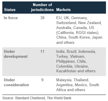 corporates subject to the carbon tax can offset up to 5% of their exposure to the tax with specific high-quality project-based carbon credits. A similar mechanism is in place in China and South Africa, with other countries also considering this hybrid mechanism, for example Vietnam.