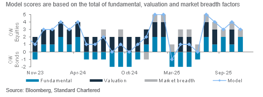 of 5 indicates clear preference for equities over bonds, given supportive fundamental and technical factors