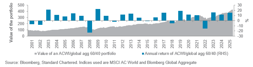 Against this backdrop, the implication for a diversified portfolio is meaningful. Historically, a 60/40 equity/bond allocation generated positive annual returns roughly 76% of the time over the last 25 years. Looking ahead, the expected returns for a 60/40 portfolio remain constructive at 6.1%, supported by higher carry in fixed income and stable, though moderating, equity earnings growth, still serving as a good starting point for long-term investors.
