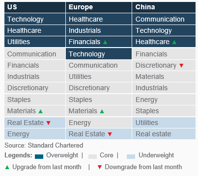 A second way to avoid excessive concentration in US technology is via our sector picks. While we remain Overweight the US technology sector, we are also Overweight the US healthcare and utilities sectors. While utilities has some overlap with AI via soaring demand for energy for data centres, it is arguably more defensive in nature. We also expect the healthcare sector to benefit from a reduction in regulatory uncertainty and inexpensive valuations. Indeed, we have replicated the combination of being Overweight both technology and healthcare sectors, to balance the technology sector’s exposure, across the US, Europe and China.
