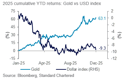 - Theme #3 – Diversifiers: Chasing glitter. Gold to extend gains in 2026, but alternative strategies and currencies like JPY and CNH are key to diversification.