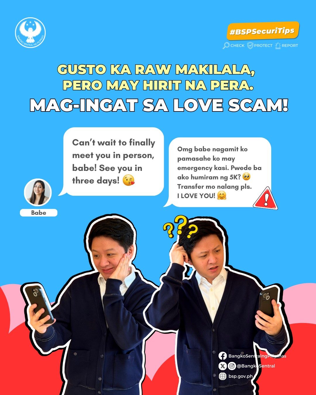 #BSPSecuriTips: Hindi lahat ng online romance ay totoo. Mag-ingat kapag ang ka-chat o kausap ay nagmamadaling makuha ang tiwala mo at biglang humihingi ng pera.