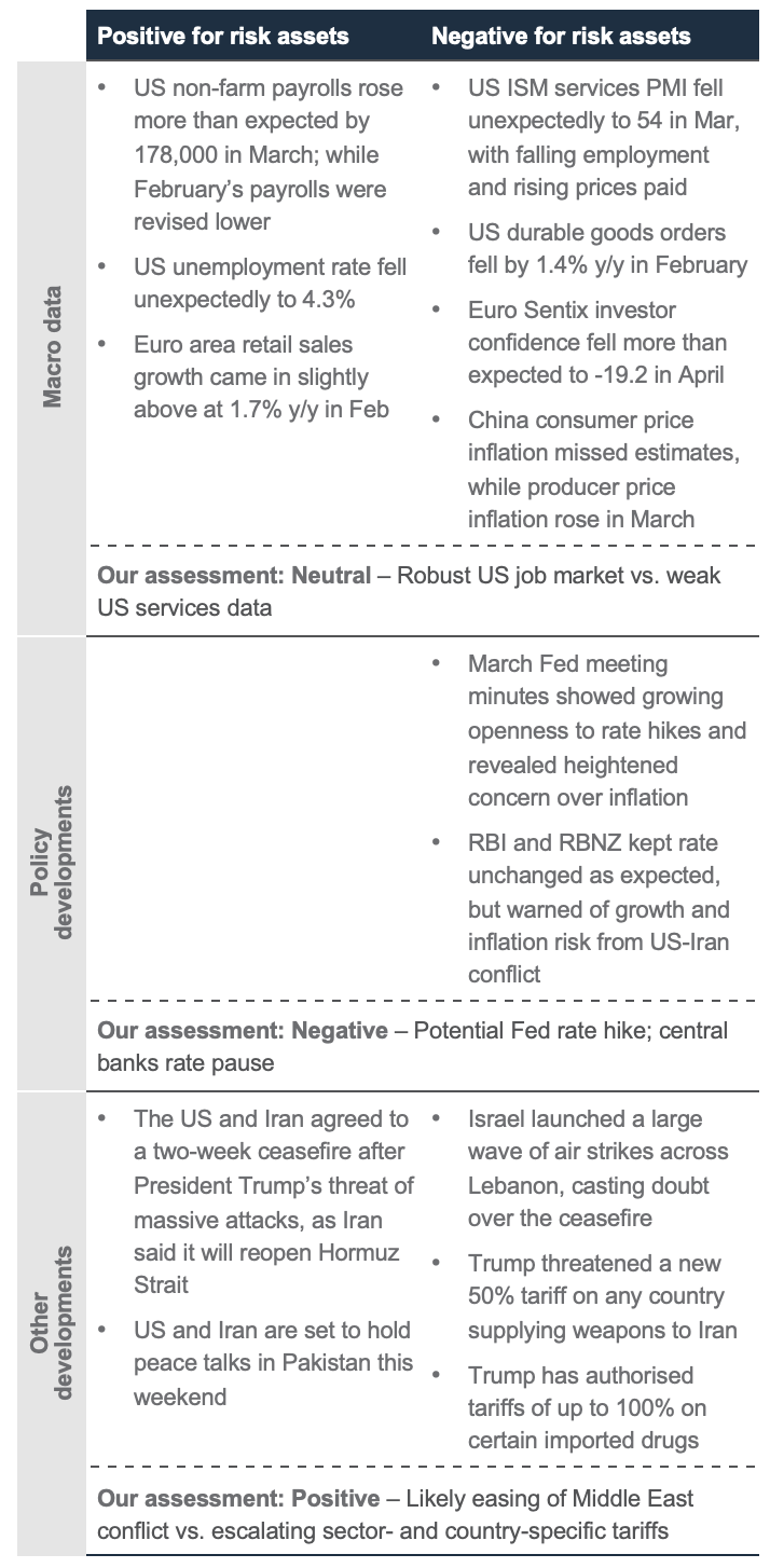 Not out of the woods yet. Near term optimism aside, the ceasefire does not eliminate the downside risk scenario. We continue to monitor two risks. First is the negotiation process itself, which needs to progress positively towards a long-lasting agreement. A failure to do so would risk a resumption of hostilities and a new surge in energy prices. The negotiation process itself is unlikely to be smooth, which could result in some two-way volatility over the course of the two-week ceasefire even if the trend in risky assets is a positive one.