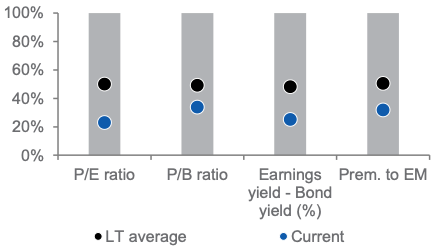 Percentile of key valuation parameters vs. their respective 10-year averages for Indian equities