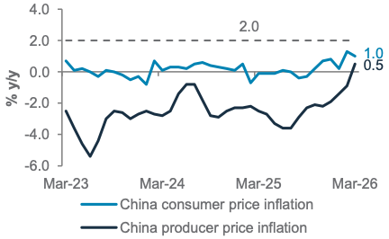 China consumer price inflation rose less than expected in March, while producer price inflation rose by 0.5% y/y, marking the first increase in over 41 months and ending a long deflationary streak