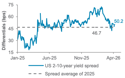 US Treasury 2-10-year yield spread has returned to levels last seen in 2025
