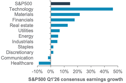 S&P500 earnings are expected to grow by 14.4% in Q1 2026, led by the technology, materials and financials sectors
