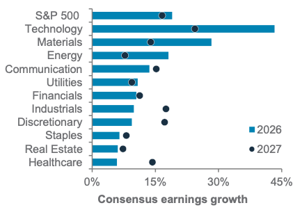 The consensus estimate for full-year 2026 earnings growth so far remains resilient at 19.0%, revised up from an initial 15.6% estimated at the start of the year. Growth in 2027 is also projected to be healthy at 16.6%. US strength continues to be broad-based, with positive growth forecasts across all sectors in 2026 and 2027. Technology leads with a projected growth of +43.3% in 2026 and +24.4% in 2027, driven by strong AI capital expenditure (capex) growth. We expect sustained AI investment to be a significant underpinning for overall US earnings growth over the next year.