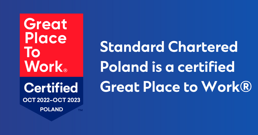 November 2, 2022Polskie biuro Standard Chartered po raz drugi z rzędu zdobyło certyfikat Great Place to Work®, przyznany w oparciu o pozytywną ocenę kultury organizacji ze strony jej pracowników. Nagroda stanowi ukoronowanie badania certyfikującego w formie ankiety, w której wypowiedziały się aktualnie zatrudnione osoby.