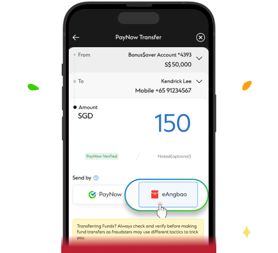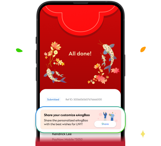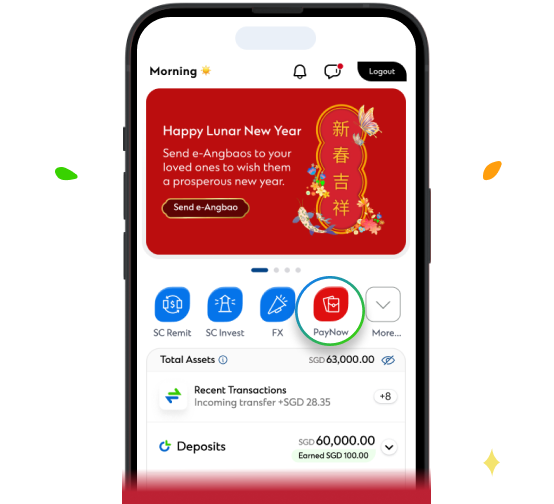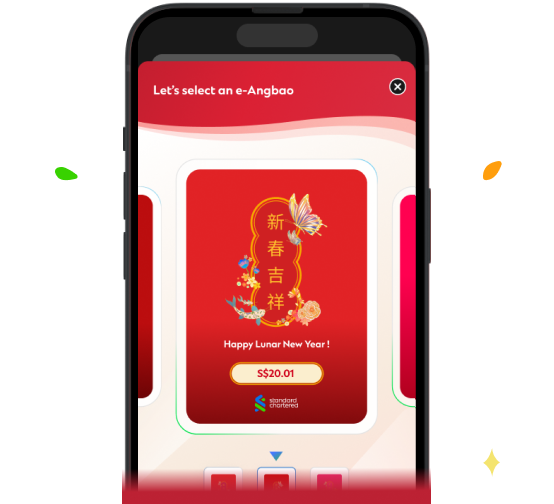 e-Angbao is a convenient and sustainable way to uphold the Lunar New Year tradition of giving and receiving red packets (angbaos). It allows you to transfer money from your bank account to anyone with a registered PayNow entity via the SC Mobile app, where you can also include a customised greeting for the recipient.