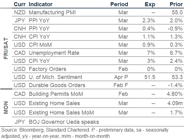 Downside pressure on USD amid easing Middle East tensions: The USD index (DXY) extended its decline for a fourth consecutive session as signs of de-escalation emerged in the Middle East. The US is set to host talks with Israel and Lebanon to discuss ongoing ceasefire negotiations, after Iran’s parliamentary speaker described Lebanon as an “inseparable part of the ceasefire.” President Trump also said he was “very optimistic” about reaching a deal with Iran. Meanwhile, February’s PCE inflation – the Fed’s preferred inflation gauge – came in largely in line at 2.8% y/y, with core PCE at 3% y/y. Firm inflation coincided with a 0.5% m/m increase in consumer spending, although personal income slipped 0.1%. Momentum indicators suggest further USD downside, with DXY likely to test near-term support at the 50-day moving average of 98.6. Attention now turns to the March inflation report due later today.