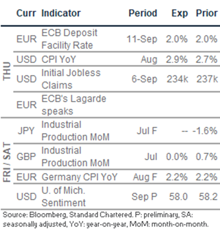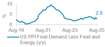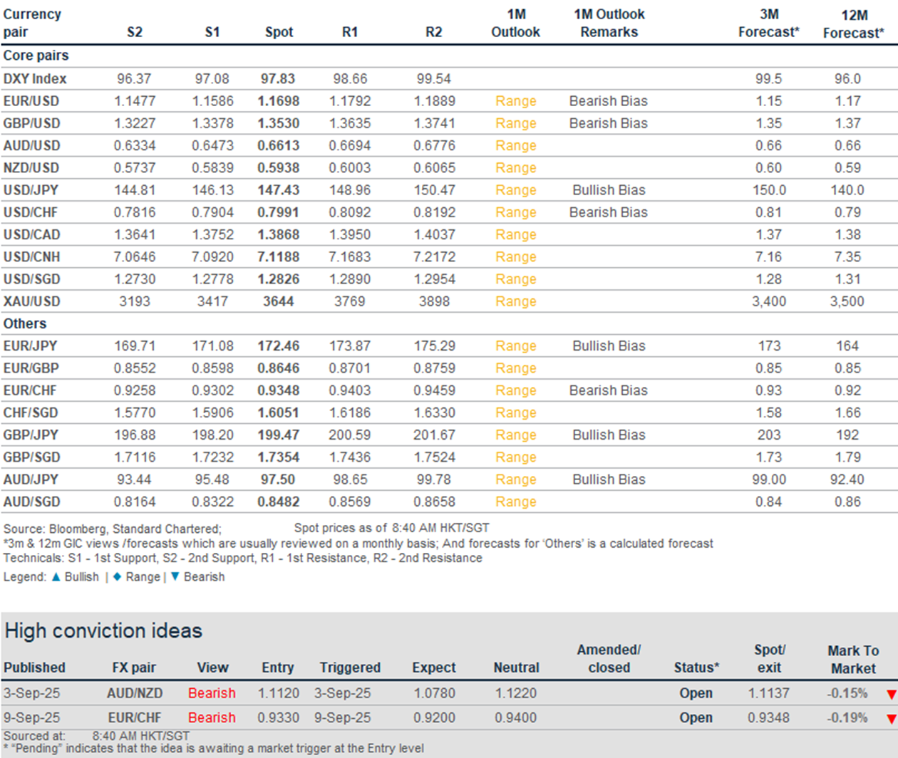 Soft US wholesale prices raise Fed rate cut hopes, undermining USD: The US dollar index (DXY) weakened after US wholesale prices unexpectedly declined in August, with July inflation also revised lower. Softer producer prices reinforce the case for a September Fed rate cut and suggest tariff-related inflation pass-through has thus far been limited. Markets are currently pricing around 25bps of Fed rate cut next week. The chance of a 50bps cut would rise if consumer inflation report for August, due tonight, significantly underwhelms, especially after August’s weak payrolls and downward revisions of past jobs data. Such an outcome could accelerate DXY downside. We see 97.1 (24 July low) as first support for DXY, while a hotter consumer inflation print could see DXY test 98.6 (100DMA).