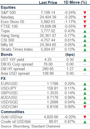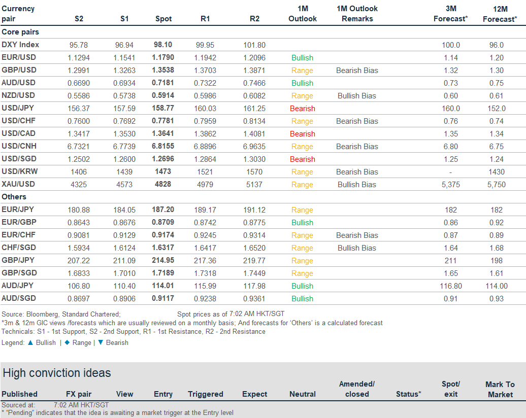 Banking activities may be carried out internationally by different branches, subsidiaries and affiliates within the Standard Chartered Group according to local regulatory requirements. Opinions may contain outright “buy”, “sell”, “hold” or other opinions. The time horizon of this opinion is dependent on prevailing market conditions and there is no planned frequency for updates to the opinion. This opinion is not independent of Standard Chartered Group’s trading strategies or positions. Standard Chartered Group and/or its affiliates or its respective officers, directors, employee benefit programmes or employees, including persons involved in the preparation or issuance of this document may at any time, to the extent permitted by applicable law and/or regulation, be long or short any securities or financial instruments referred to in this document or have material interest in any such securities or related investments. Therefore, it is possible, and you should assume, that Standard Chartered Group has a material interest in one or more of the financial instruments mentioned herein. Please refer to our Standard Chartered website under Regulatory disclosures for more detailed disclosures, including past opinions/ recommendations in the last 12 months and conflict of interests, as well as disclaimers. A covering strategist may have a financial interest in the debt or equity securities of this company/issuer. All covering strategist are licensed to provide investment recommendations under Monetary Authority of Singapore or Hong Kong Monetary Authority. This document must not be forwarded or otherwise made available to any other person without the express written consent of Standard Chartered Group.