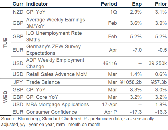 USD prone to near-term spike as US-Iran ceasefire deadline approaches: The USD was little changed on Monday, hovering around pre-Iran conflict levels, ahead of the expiry of the 14-day US-Iran ceasefire on Wednesday. US President Trump said he is unlikely to extend the ceasefire, adding that the Strait of Hormuz will remain blockaded “until a deal is signed”. Vice President Vance is due to resume talks with Iran in Pakistan. The USD index (DXY) has given back all its gains made during the conflict in March as investors assessed the worst is over. However, oil prices remain elevated, with WTI crude trading at USD 88/bbl, 35% above the pre-conflict levels. Gold prices, which had recovered more than half their losses in March, edged lower to USD 4,821/oz as some risk-off premium unwound in the absence of an escalation. Besides the US-Iran talks, the market’s focus will be on Fed Chair nominee Warsh’s testimony before the Senate Banking Committee.