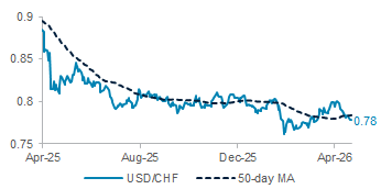 CHF intervention risk rising: The Swiss franc outperformed all major G7 currencies against the USD yesterday. USD/CHF declined 0.4% to 0.7784, its weakest level since early March. Despite recent CHF strength, the Swiss National Bank’s March foreign currency reserves data suggest that the central bank has not been actively intervening in FX markets. However, the SNB reiterated last month that its “willingness to intervene in FX markets has increased,” leaving policy action a key risk against further downside in USD/CHF.