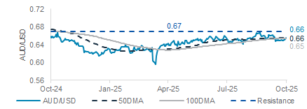 Potential AUD upside ahead of RBA meeting: AUD/USD climbed 0.7% on Monday to above both its 50- and 100-day moving averages, supported by improving risk sentiment amid a potential US-China trade deal. With the Fed expected to ease policy this week, while the RBA holds rates, the interest rate differential is likely to narrow, favouring the AUD. We see potential for further AUD upside, with the next resistance at 0.67 (September’s high). We are closing our bearish GBP/AUD trade idea to lock in profits.