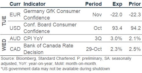 Fed meeting, potential US-China trade deal, tech earnings in focus: The USD weakened by 0.2% on Monday as investors positioned ahead of Wednesday’s Fed meeting. Markets are pricing a 25bps rate cut, with heightened attention on Fed Chair Powell’s post-meeting remarks, given limited economic data amid the ongoing US government shutdown. The Dallas Fed’s manufacturing activity indicator edged up in October, but remained in negative territory. Meanwhile, US-China trade negotiations progressed, with a potential agreement at the Trump-Xi meeting on 30 October. Expectations of an agreement lifted US stocks to record highs. Investors are also expecting strong earnings from megacap technology sector this week. Improved risk sentiment is likely to weigh on the USD. We see the next support for the USD index (DXY) at its 50-day moving average around 98.1.