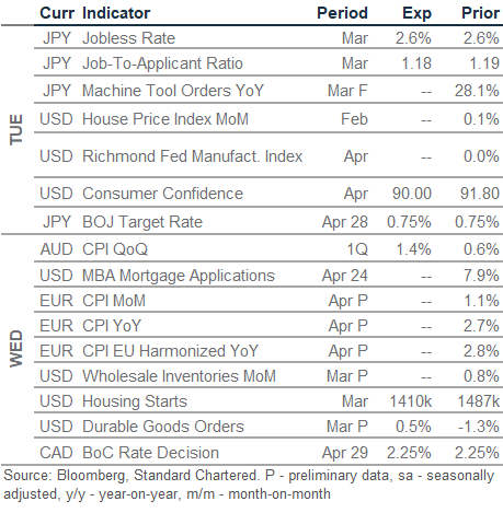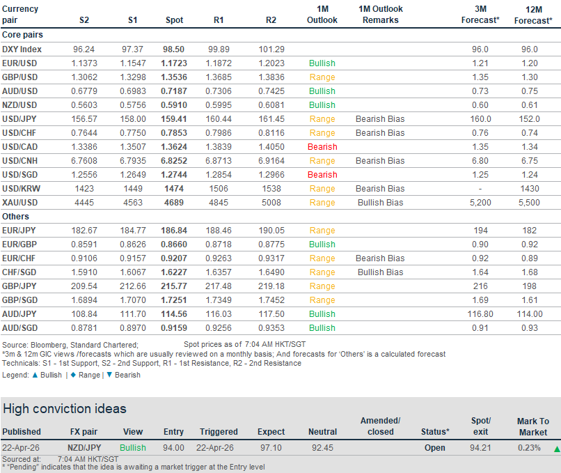 All eyes on Middle East talks, central bank policy meetings. The USD softened following reports that Iran submitted a new ceasefire proposal where it sought a ceasefire extension and deferral of nuclear talks pending the lifting of the US blockade of the Strait of Hormuz. The White House acknowledged the proposal but reiterated ‘red lines’ on any deal. Besides uncertainty around US-Iran talks, FX markets will be focused this week on Fed, ECB, BoJ and BoE policy meetings. The 28-29 April Fed meeting may mark Jerome Powell’s final meeting as Fed Chair, with Kevin Warsh expected to assume the role in May. We expect all four major central banks to hold rates this week amid a surge in near-term inflation. However, the ECB and BoE are likely to adopt a more hawkish stance vs. the Fed, given a sharper rise in near-term inflation expectations in Europe. A more hawkish ECB could push the USD index (DXY) towards the bottom of its recent 97.8-99.3 range.