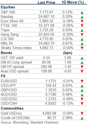 Banking activities may be carried out internationally by different branches, subsidiaries and affiliates within the Standard Chartered Group according to local regulatory requirements. Opinions may contain outright “buy”, “sell”, “hold” or other opinions. The time horizon of this opinion is dependent on prevailing market conditions and there is no planned frequency for updates to the opinion. This opinion is not independent of Standard Chartered Group’s trading strategies or positions. Standard Chartered Group and/or its affiliates or its respective officers, directors, employee benefit programmes or employees, including persons involved in the preparation or issuance of this document may at any time, to the extent permitted by applicable law and/or regulation, be long or short any securities or financial instruments referred to in this document or have material interest in any such securities or related investments. Therefore, it is possible, and you should assume, that Standard Chartered Group has a material interest in one or more of the financial instruments mentioned herein. Please refer to our Standard Chartered website under Regulatory disclosures for more detailed disclosures, including past opinions/ recommendations in the last 12 months and conflict of interests, as well as disclaimers. A covering strategist may have a financial interest in the debt or equity securities of this company/issuer. All covering strategist are licensed to provide investment recommendations under Monetary Authority of Singapore or Hong Kong Monetary Authority. This document must not be forwarded or otherwise made available to any other person without the express written consent of Standard Chartered Group.