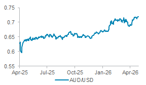 AUD testing resistance. AUD gained on rising commodity prices, with AUD/USD testing resistance at 0.7306. Elevated energy prices are lifting the broader commodity complex, underpinning AUD sentiment. The AUD also benefits from the absence of near-term RBA decisions, with the next policy meeting on 27 May.