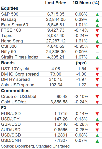 Banking activities may be carried out internationally by different branches, subsidiaries and affiliates within the Standard Chartered Group according to local regulatory requirements. Opinions may contain outright “buy”, “sell”, “hold” or other opinions. The time horizon of this opinion is dependent on prevailing market conditions and there is no planned frequency for updates to the opinion. This opinion is not independent of Standard Chartered Group’s trading strategies or positions. Standard Chartered Group and/or its affiliates or its respective officers, directors, employee benefit programmes or employees, including persons involved in the preparation or issuance of this document may at any time, to the extent permitted by applicable law and/or regulation, be long or short any securities or financial instruments referred to in this document or have material interest in any such securities or related investments. Therefore, it is possible, and you should assume, that Standard Chartered Group has a material interest in one or more of the financial instruments mentioned herein. Please refer to our Standard Chartered website under Regulatory disclosures for more detailed disclosures, including past opinions/ recommendations in the last 12 months and conflict of interests, as well as disclaimers. A covering strategist may have a financial interest in the debt or equity securities of this company/issuer. All covering strategist are licensed to provide investment recommendations under Monetary Authority of Singapore or Hong Kong Monetary Authority. This document must not be forwarded or otherwise made available to any other person without the express written consent of Standard Chartered Group.