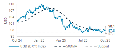 Potential USD downside amid shutdown and labour market weakness: The USD snapped a four-day losing streak, inching up 0.1% on Thursday, even as the release of jobless claims figures was postponed due to the ongoing government shutdown. Treasury Secretary Scott Bessent warned that the shutdown could dampen US economic growth, adding downside pressure to the dollar.  Meanwhile, according to a report from global outplacement firm, Challenger, Gray & Christmas, while job cuts in September dropped sharply by 25.8% y/y, planned hiring slumped to the lowest in 16 years, signalling potential stagnation in the labour market. Should the government fail to reach a resolution this week, the release of September’s unemployment rate and nonfarm payroll data will risk being postponed. We see the next support of the USD at 97.1. Meanwhile, equity markets remain resilient, with major US benchmarks hitting record highs.