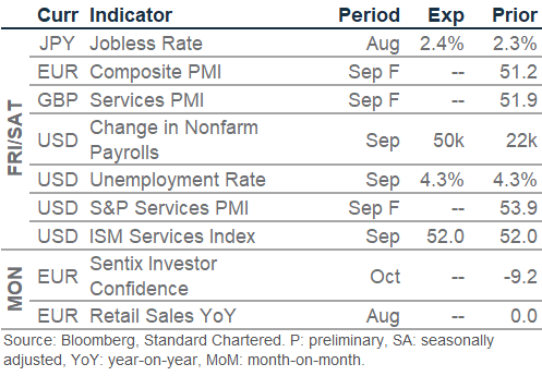 AUD likely to trade in a range despite upward PMI revisions: Australia’s imports rose by 3.2% m/m in August, while exports declined notably by 7.8%, leading to a weaker-than-expected trade balance of AUD 1.8bn. AUD/USD slipped by 0.3% on Thursday. Although final readings of Australia’s Composite and Services PMI by S&P Global – due this morning – reflected upward revisions for September, we expect the AUD to respond positively initially, and trade in a range near-term, with resistance seen at 0.67 (September’s high).