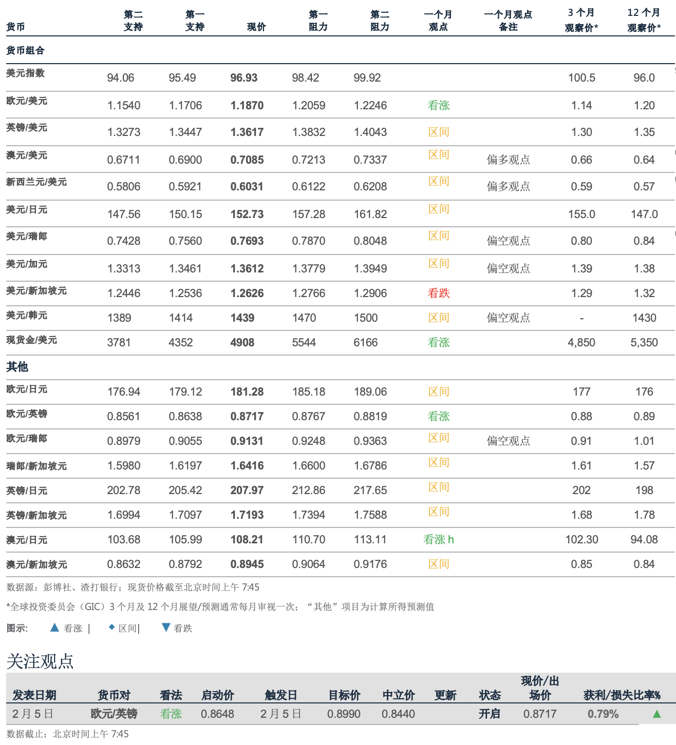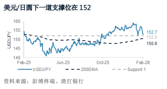 美元兑日元或将企稳:避险货币走强,美元兑瑞郎和美元兑日元周四均下跌约0.3%。由于上周末众议院选举后市场担忧央行可能干预汇率,美元兑日元本周大幅下跌。首相高市早苗也局部缓解了市场对拟议的食品消费税减免方案不会通过发行债券融资的担忧。同时,日本1月生产者物价指数同比增2.3%(环比增加0.2%),符合预期,这进一步支持了日本央行进一步加息的必要性。我们预计美元兑日元将在152水平附近企稳,下一个关键支撑位在200日移动均线附近,约为150.6。
