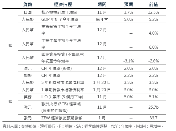 歐美緊張局勢升溫,美元恐有上行空間:美元週五收盤持平。此前,美國總統川普暗示不願提名其首席經濟顧問哈塞特擔任下屆聯準會主席,此番言論一度推升美元觸及盤中高點。聯準會理事鮑曼重申,有鑑於就業市場脆弱,需為進一步降息做好準備;這與哈馬克和羅根等反對進一步降息的鷹派官員立場形成對比。同時,美國 12 月工業生產月增 0.4%,優於預期。在前值上修後,產能利用率也回升至 76.3%。市場焦點現轉向升溫中的歐美緊張局勢。川普威脅,除非美國獲准向丹麥購買格陵蘭,否則將對歐洲盟友徵收最高 25% 的關稅。歐盟領袖表示,這些關稅恐使跨大西洋關係陷入「危險的螺旋式惡化」。緊張局勢升溫可能推升美元指數 (DXY) 測試 100 的阻力位。