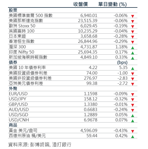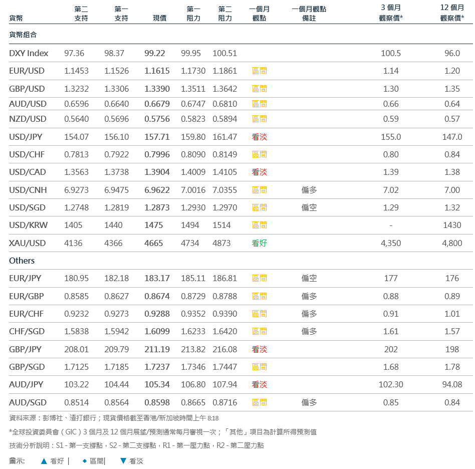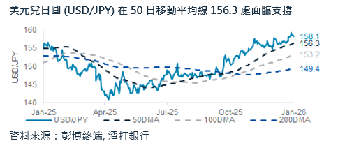 干預風險當前,看空美元兌日圓:在日本財務大臣片山皋月警告可能進行貨幣干預後,美元兌日圓週五滑落 0.3%。受潛在的眾議院解散與提前改選擔憂影響,過去一週該貨幣對持續在 155-160 區間的上緣震盪。我們預期日圓將進一步走強,該貨幣對可能緩步測向 50 日移動平均線 156.3 的支撐位。