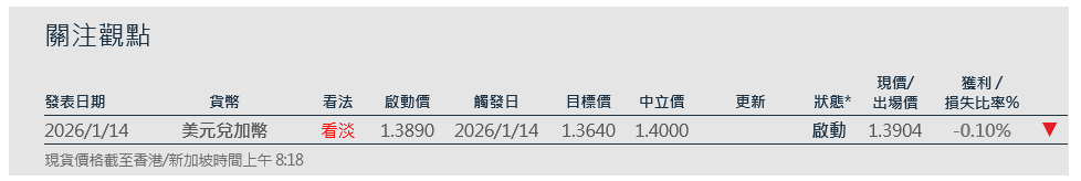 油價反彈,看空美元兌加幣:在加拿大與中國達成旨在降低對美貿易依賴的協議後,美元兌加幣週五小幅突破 100 日移動平均線。然而,近期油價回升預料將在短期內支撐加幣走勢。該貨幣對日益過度延伸的部位,也預留了下行修正的空間。我們認為該貨幣對的下一道支撐位在 1.3738。