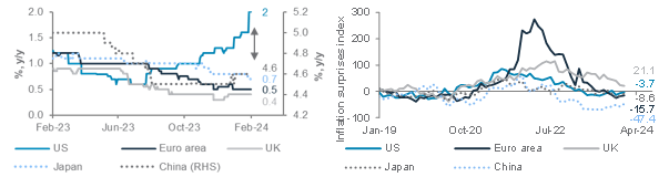 2024 GDP growth estimates and inflation surprise indices across major economies
