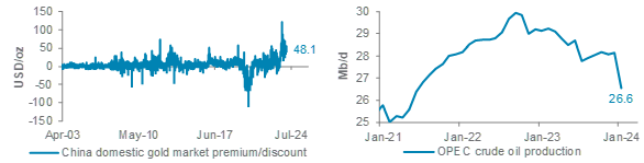 China dethroned India as the world’s largest gold jewellery buyer in 2023. Gold jewellery purchases in China rose 10% y/y. In addition, China has also maintained its position as the world’s largest gold consumer since 2013. Weak Chinese equity and property markets, as well as low domestic interest rates, have driven households to look for alternative investment opportunities. Gold has emerged as an attractive option given its ability to store value and to lower portfolio volatility. This is evidenced in the widening premium in the Shanghai Gold Exchange. We believe this trend will continue this year, supporting physical gold demand in China.