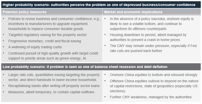 The flurry of measures to put a floor under the stock market has raised the question whether Chinese equities are now poised for a turnaround. Our views are as follows:
