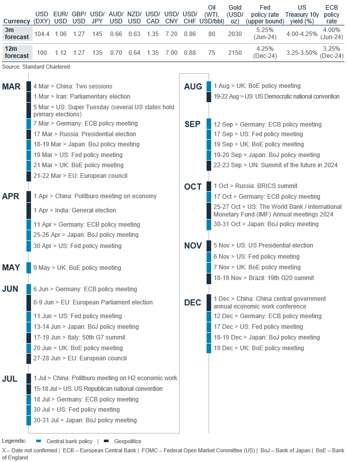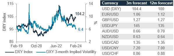 The FX market has been unusually muted lately, with the US dollar index’s (DXY) 3-month implied volatility reaching a 2-year low. We expect a rangebound USD, with a bullish bias, over the next 3 months. US economic activity indicators have remained resilient, especially relative to the non-US regions, and markets continue to push back their anticipated timing of the first Fed rate cut. These factors drive the rise in our DXY 3-month forecast to 104.4. However, this does not alter our view that a USD downtrend is likely to resume over 6-12-months, with US bond yields likely capped by the prospects of slowing growth.