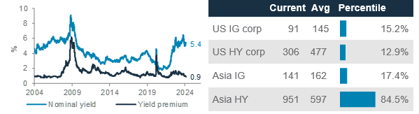 Fig. 11 Corporate bond nominal yields are attractive relative to their own history (LHS); Asia HY bond yield premium stands out among USD bond peers (RHS)