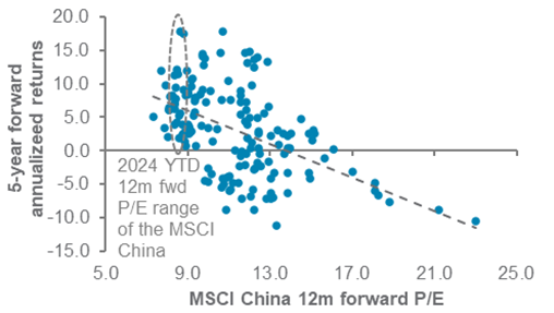 MSCI China 12m forward P/E and 5-year annualised returns