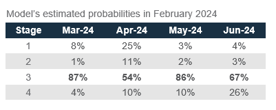 The model remains in Stage 2, where it has been since December 2023 despite it signalling a high probability of moving to Stage 3 in coming months. In Stage 2, the model signals low downside risks in US equities and US government bonds. The model’s view is driven by a positive year-on-year change in US housing starts in January. This factor, however, reversed in February, which risks moderating this improvement. Historical data suggests risky assets such as equities and alternatives should do well in Stage 2.