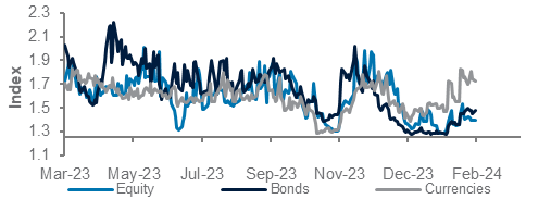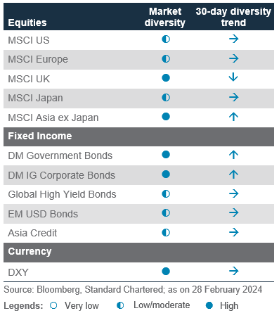 Diversity in bond markets has also improved after initially falling below 1.25 at the beginning of year. Most bond markets gained 9-12% from October to December 2023, when the Fed was more dovish. These trends have either reversed or have slowed down after our diversity indicator flagged extremely low investor diversity. DM government bond has led the drop with a 2.8% decline.
