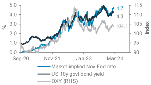 We remain Overweight Developed Market (DM) Investment Grade (IG) government bonds and see an attractive opportunity to add exposure following this year’s rebound in US bond yields. We raise our 3-month target for 10-year US government bond yield slightly to 4.00-4.25% amid market repricing of higher-for-longer Fed policy rate, rising Treasuries supply and quantitative tightening (QT). We still expect the yield to move to 3.25-3.50% over 12-months as Fed rate cuts start in June.